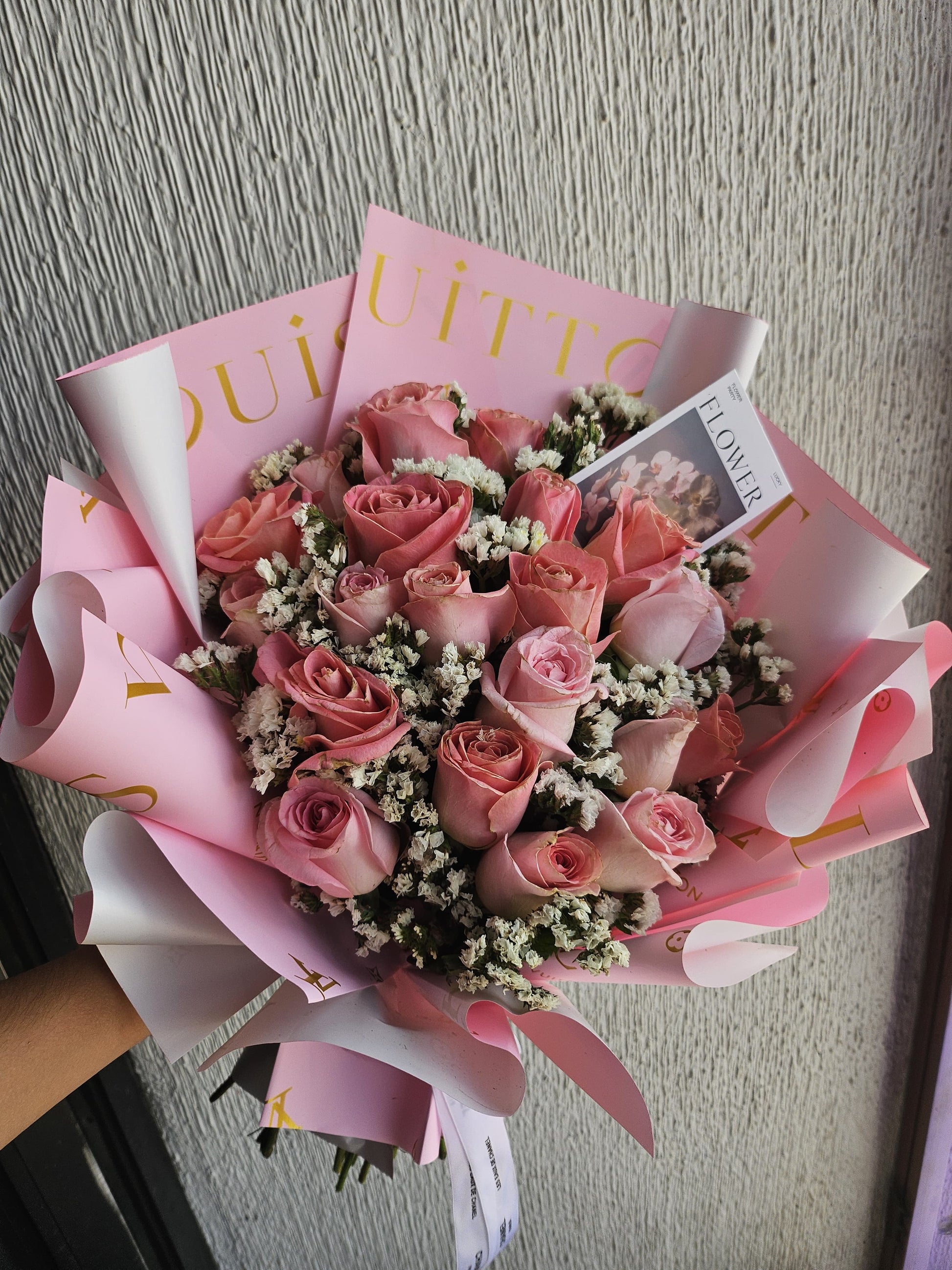 Ramo con 22 rosas color rosa especial, con follaje de statis para resaltar las flores y envuelto en papel coreano de una manera exquisita. Con este ramo puedes hacer de un momento especial algo inolvidable