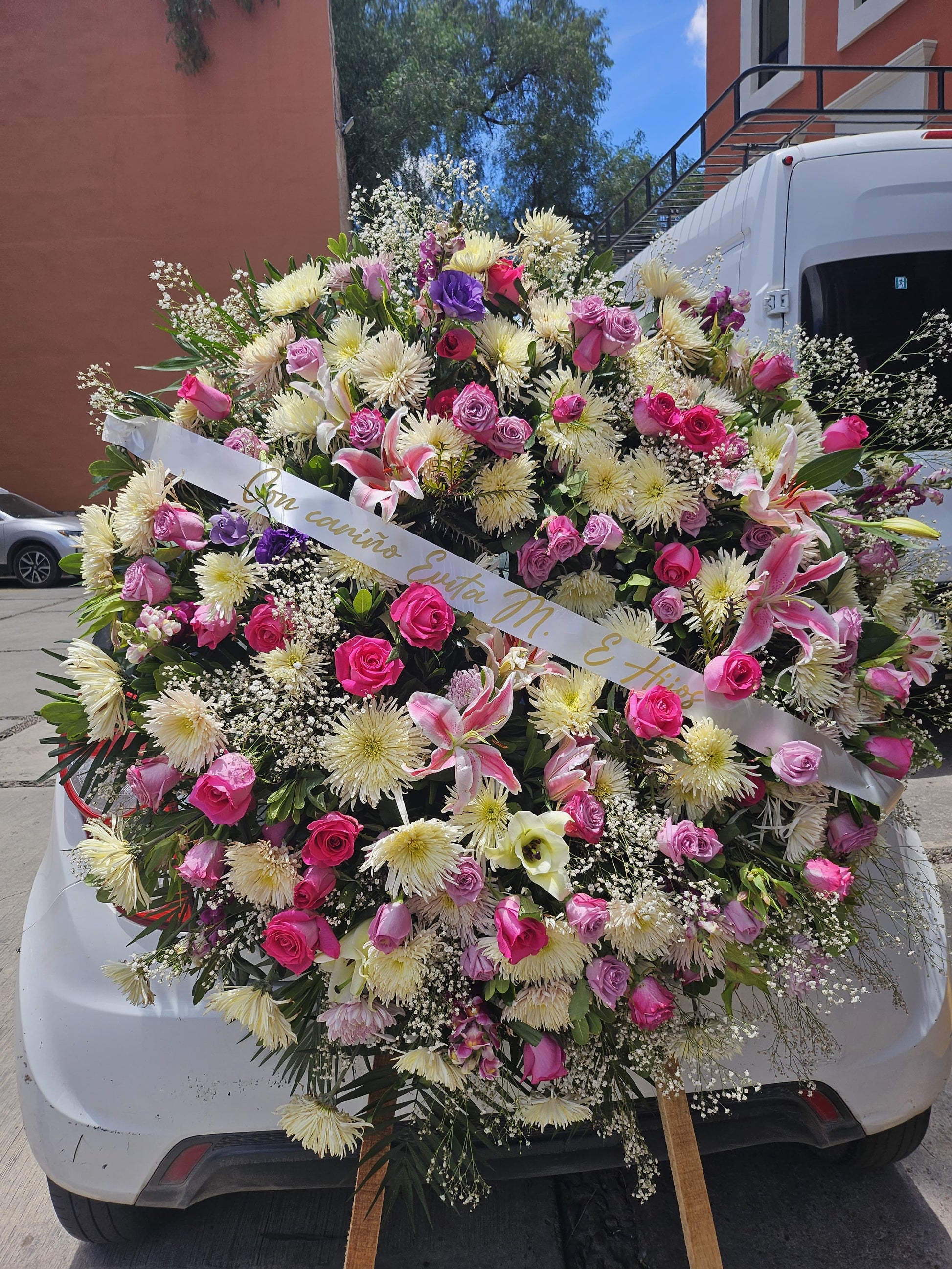 Corona de colores rosa en flor variada y fresca del dia ideal para los momentos luctuosos.