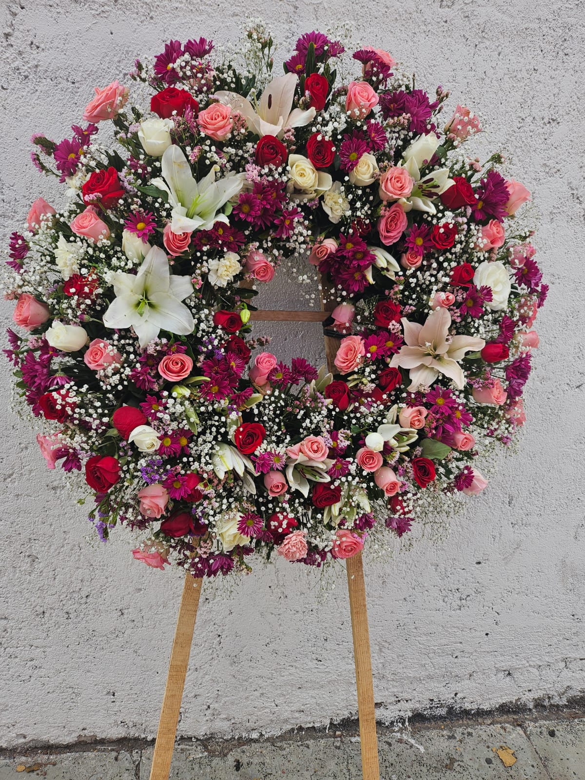 Corona artesanal con flor en tonos rosas especiales para los momentos luctuosos.