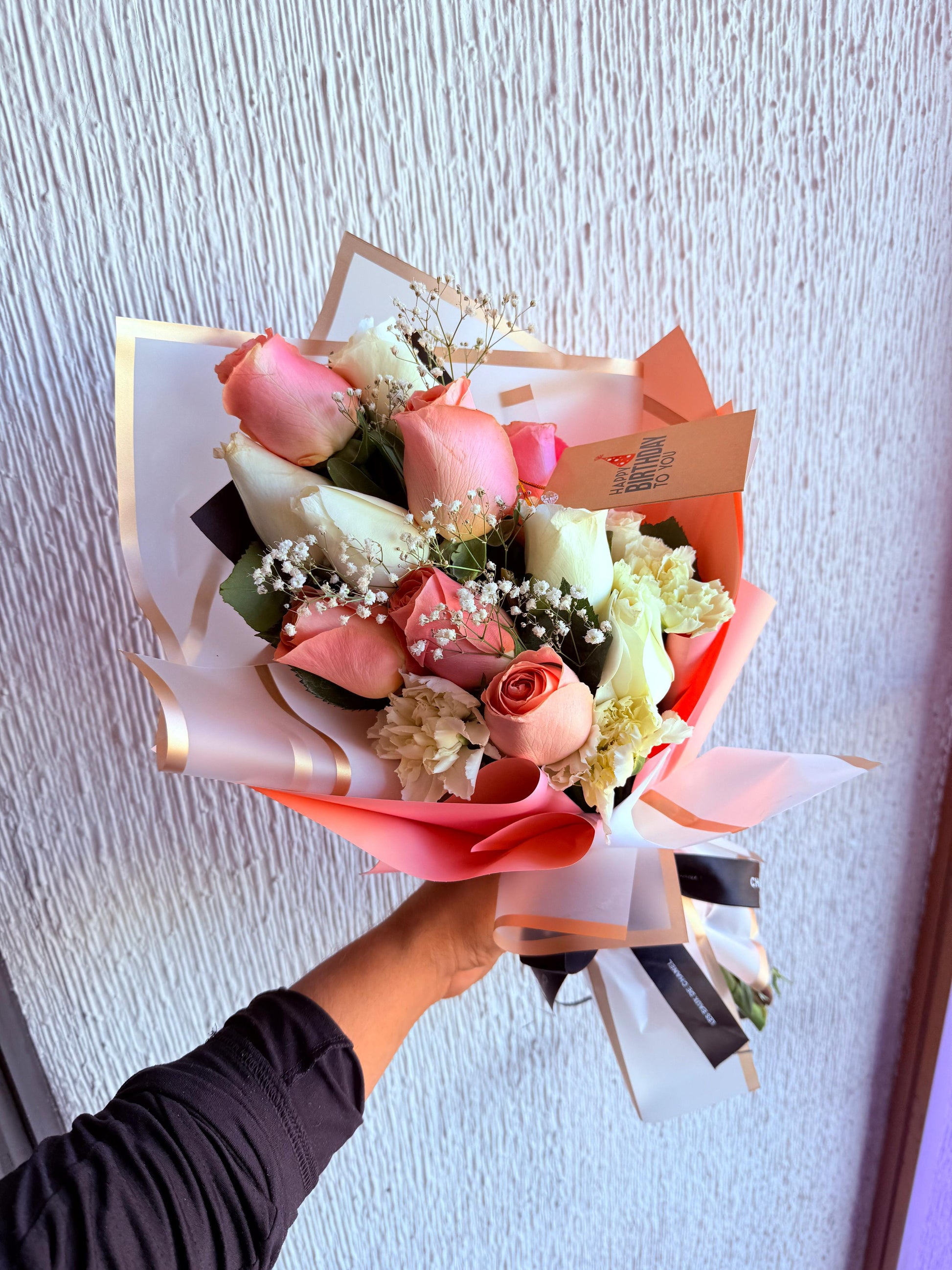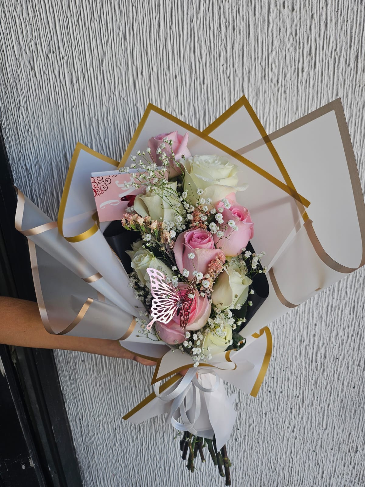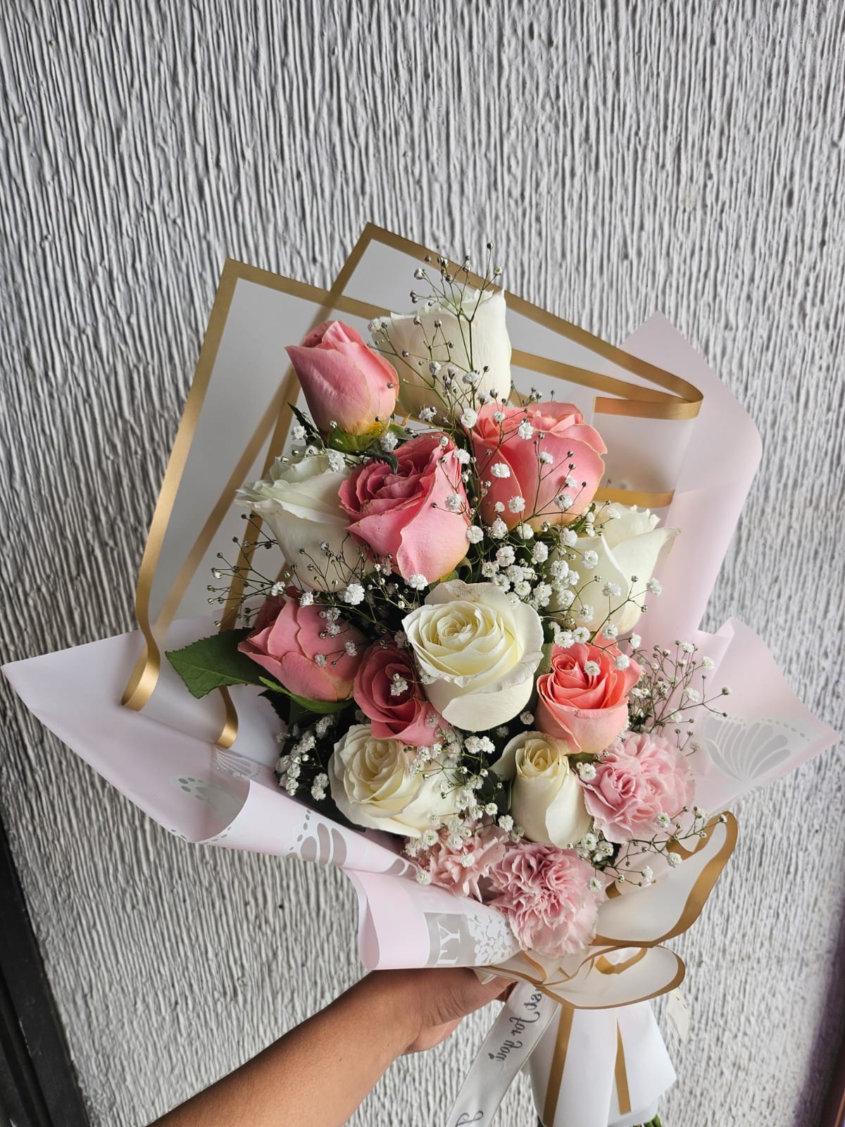 Hermosa docena mixta de rosa blanca y rosa, con nube y una envoltura especial.