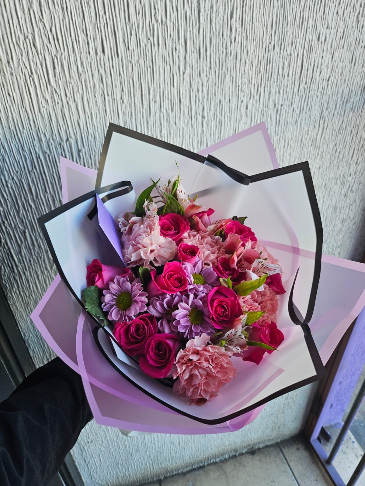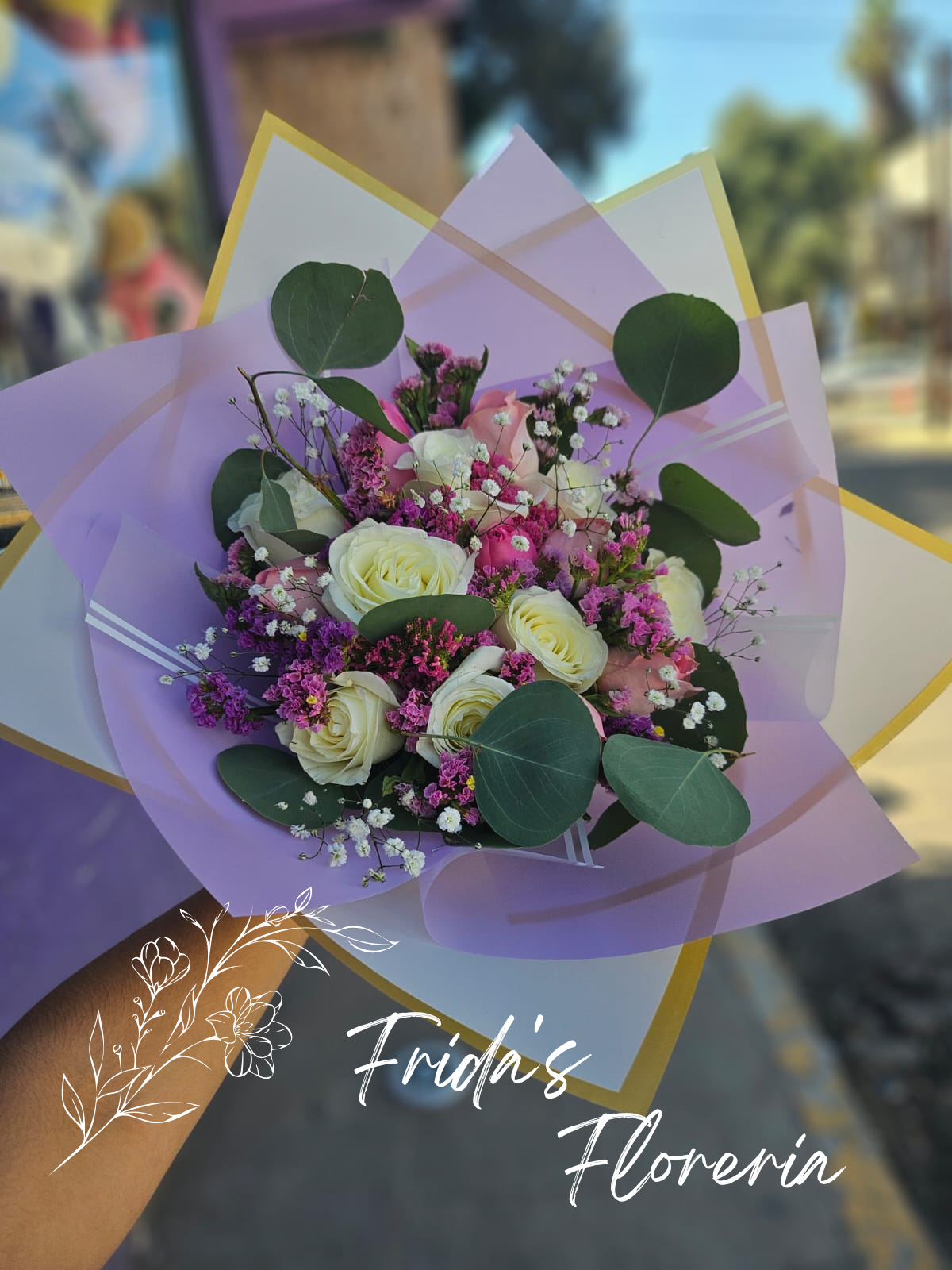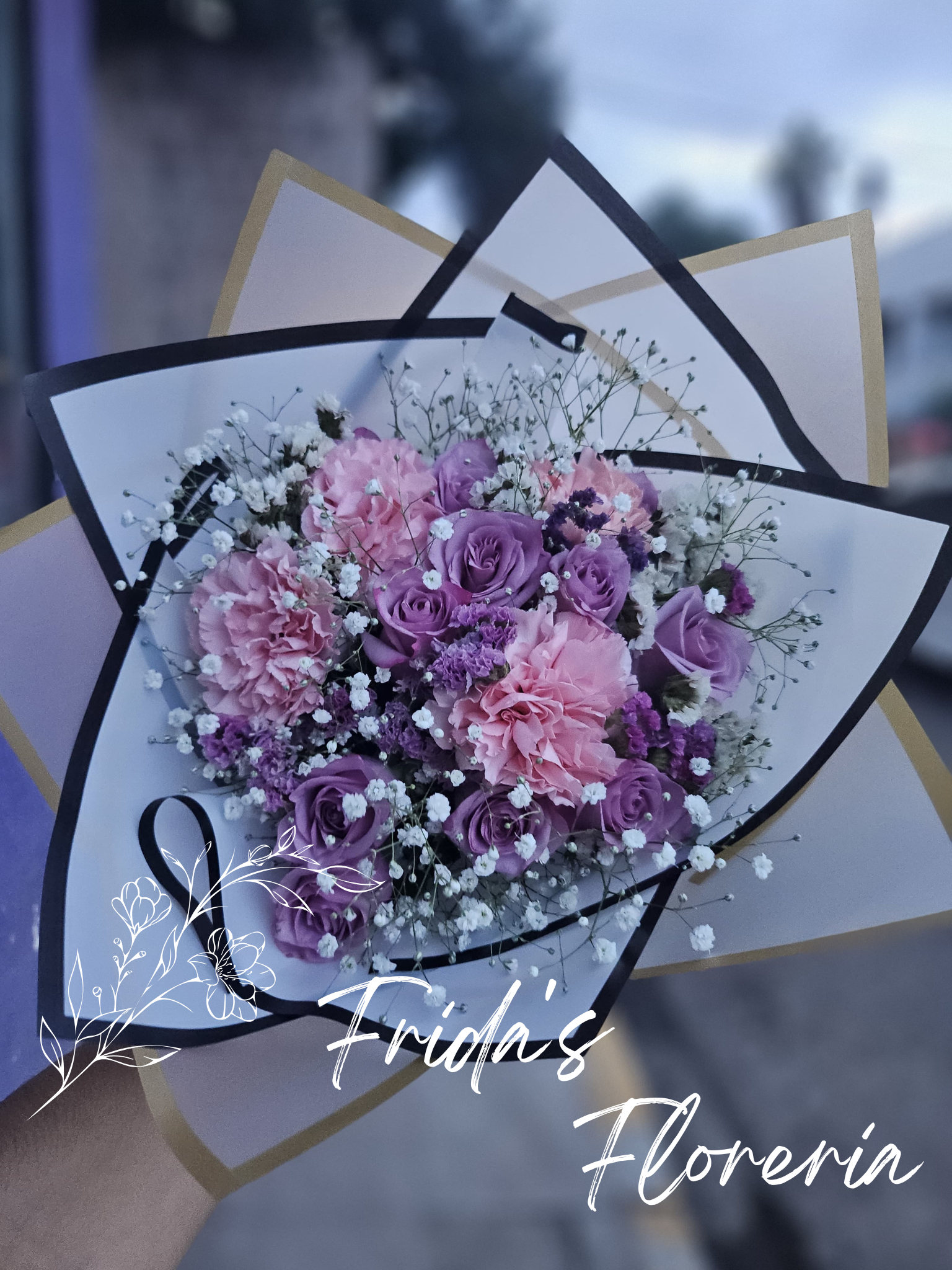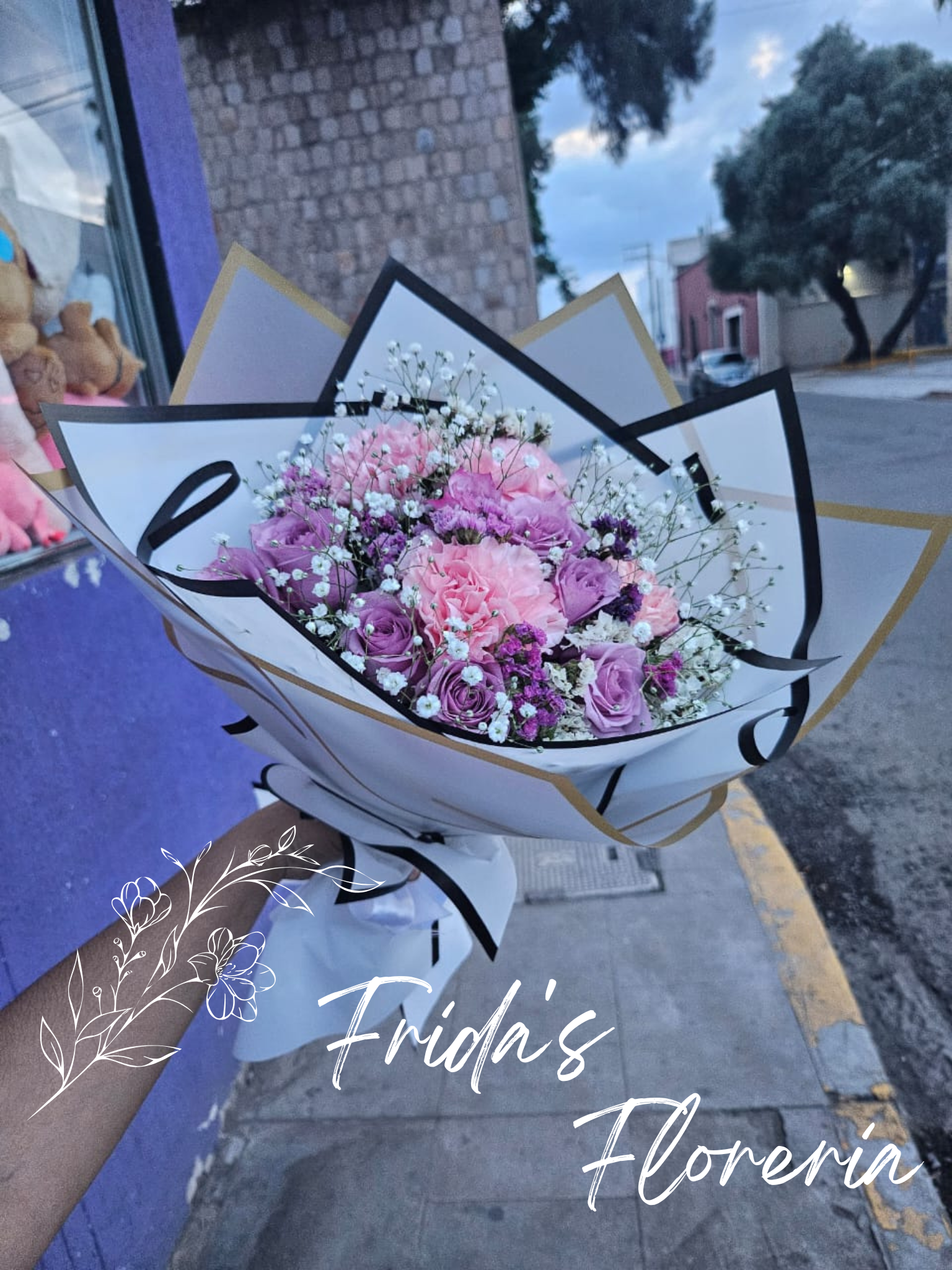 Docena de rosas de color combinadas con la delicadeza de los claveles pastel, una combinación de flores especial con flor de nube y papeles coreanos que le dan la suavidad de tonalidad