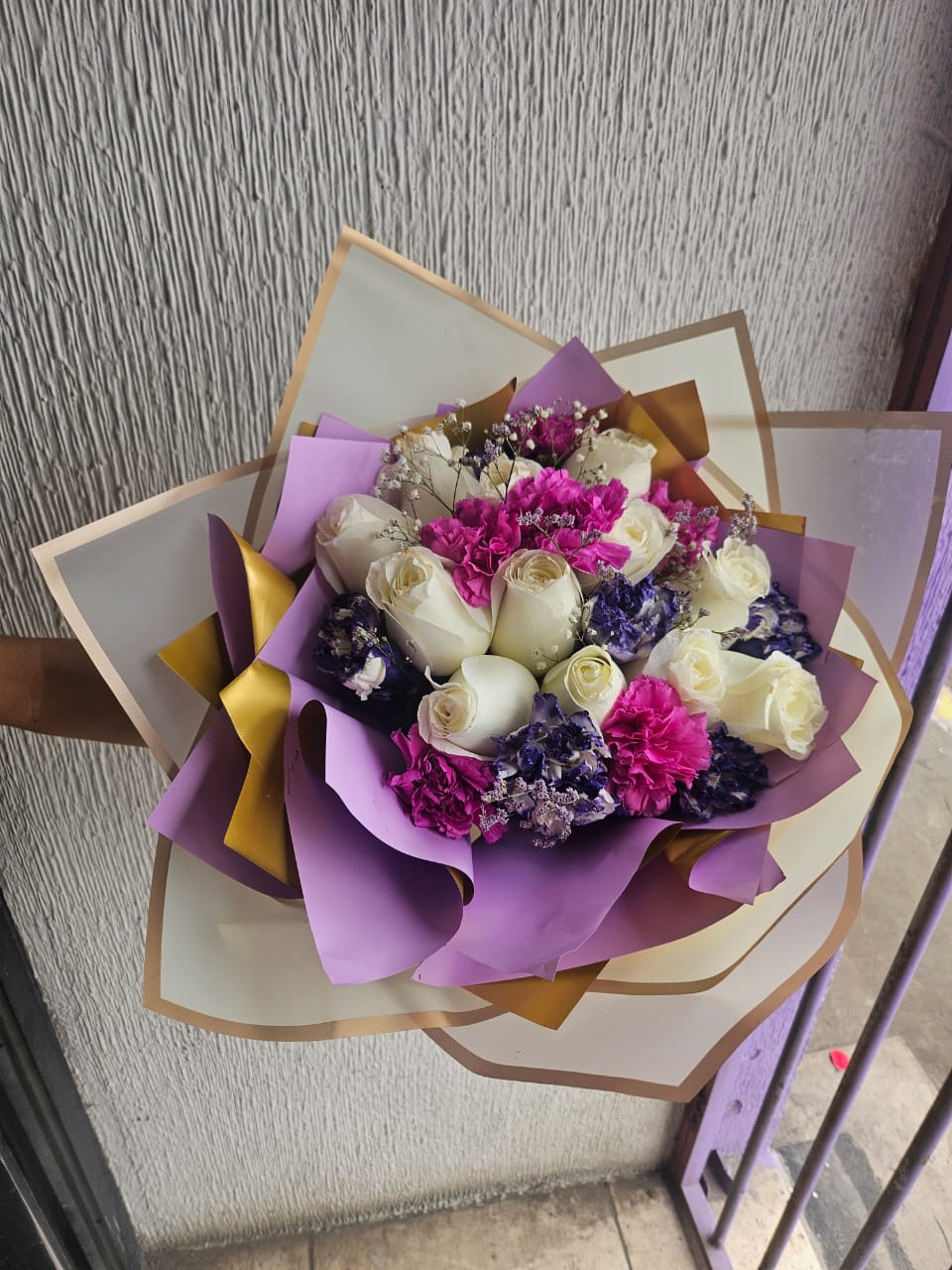 Ramo de 12 rosas blancas con claveles morados, nube y follaje.