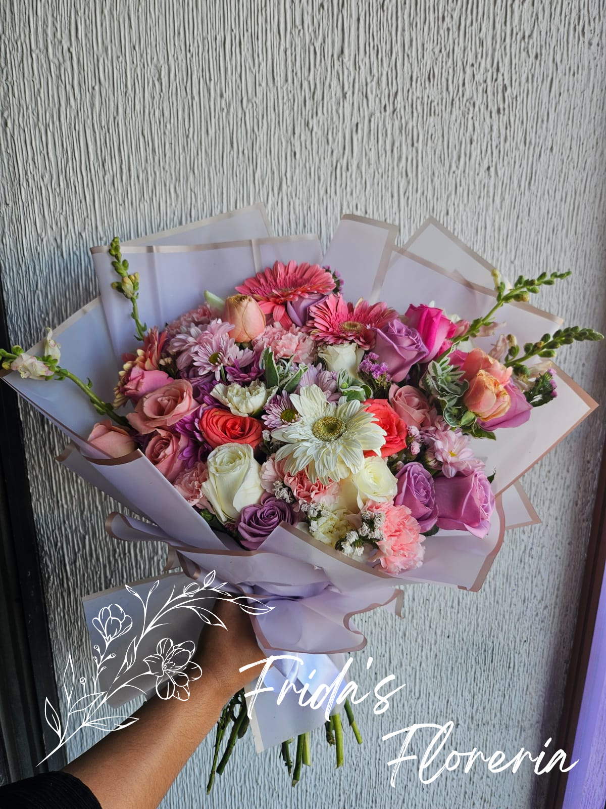 Un ramo con una envoltura delicada pero escalonada que luce elegante, tonos pasteles en sus flores entre ellas rosas, gerberas, claveles, y follajes, etc.