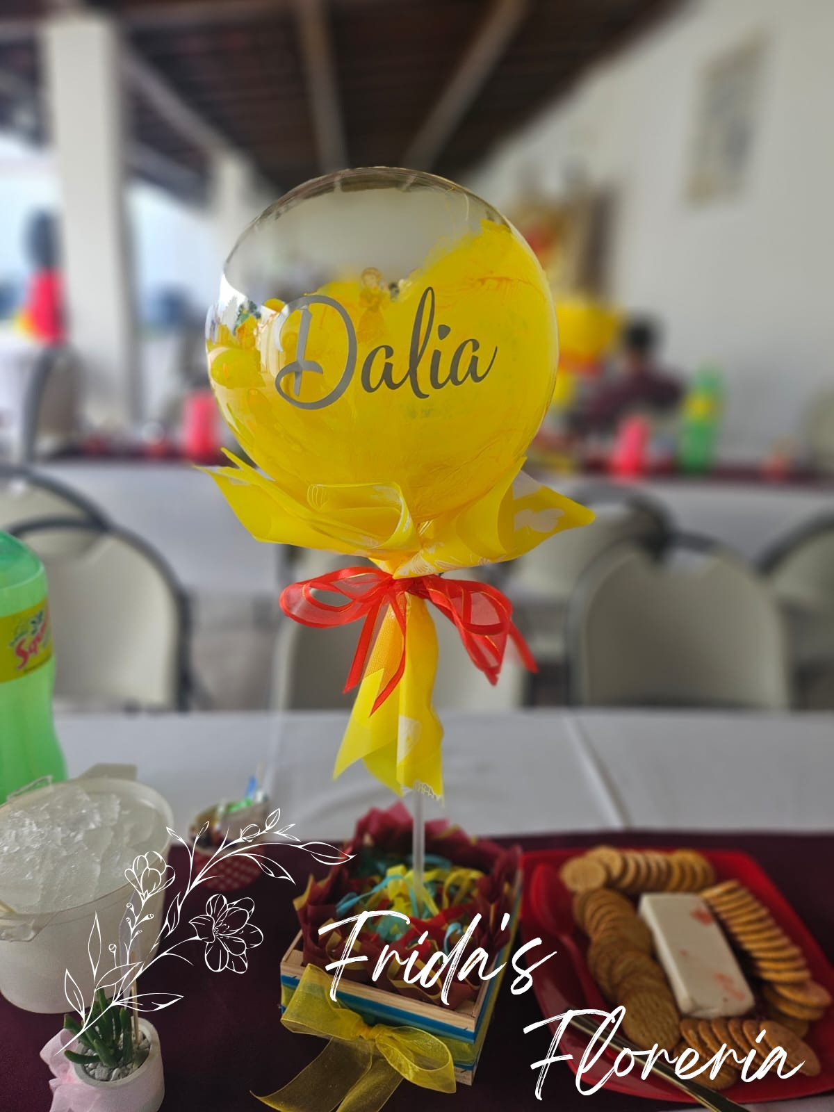 Arreglo creado especialmente en Fridas ideal para eventos, principalmente bautizos, presentaciones, baby showers, y fiestas infantiles. Estos son personalizados por lo que los colores, mensajes (nombre), pueden cambiar a peticion del cliente.