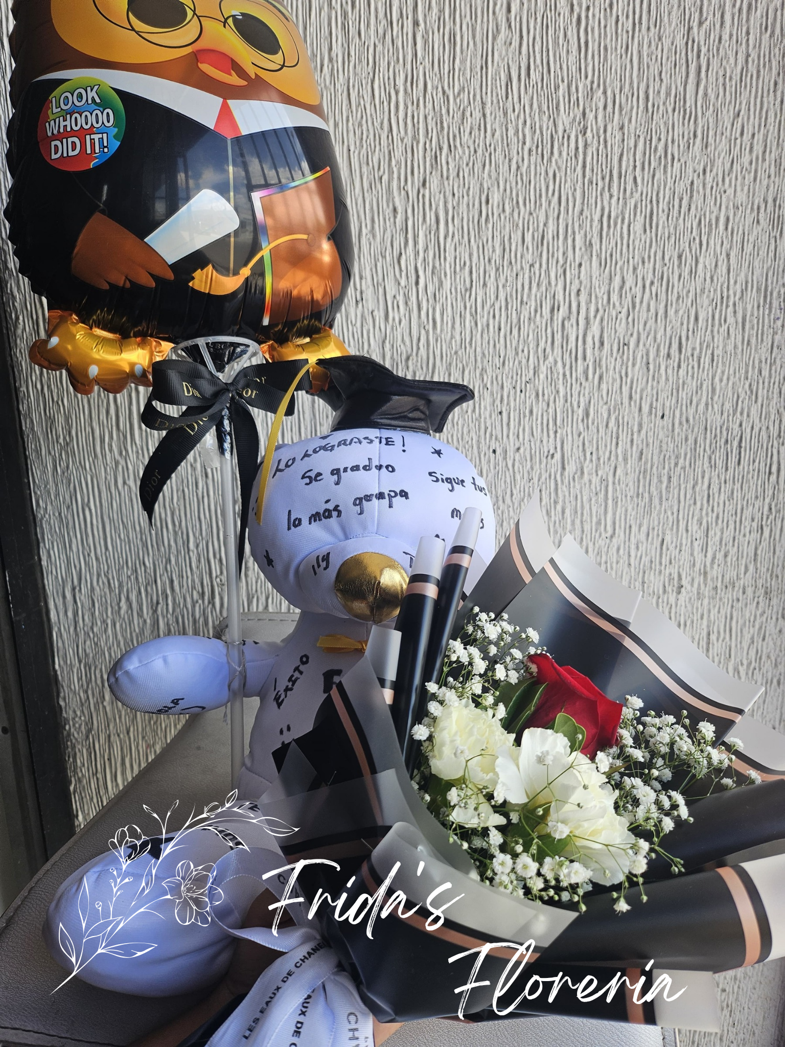 Este paquete de graduado trae consigo un ramo individual de una rosa roja arreglada en una hermosa envoltura, ademas de un osito de peluche para mensajes o firmas al graduado(incluye marcador permanente), un globo de graduacion y ademas una cajita de chocolates cortesia de FRIDA'S FLORERIA !!!