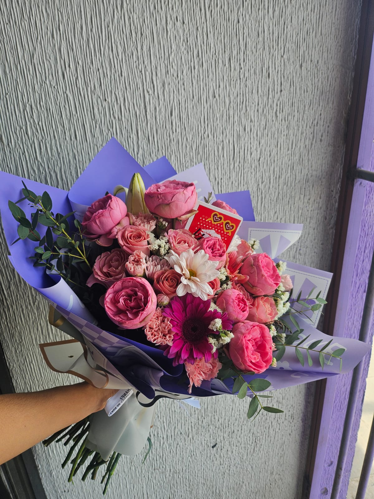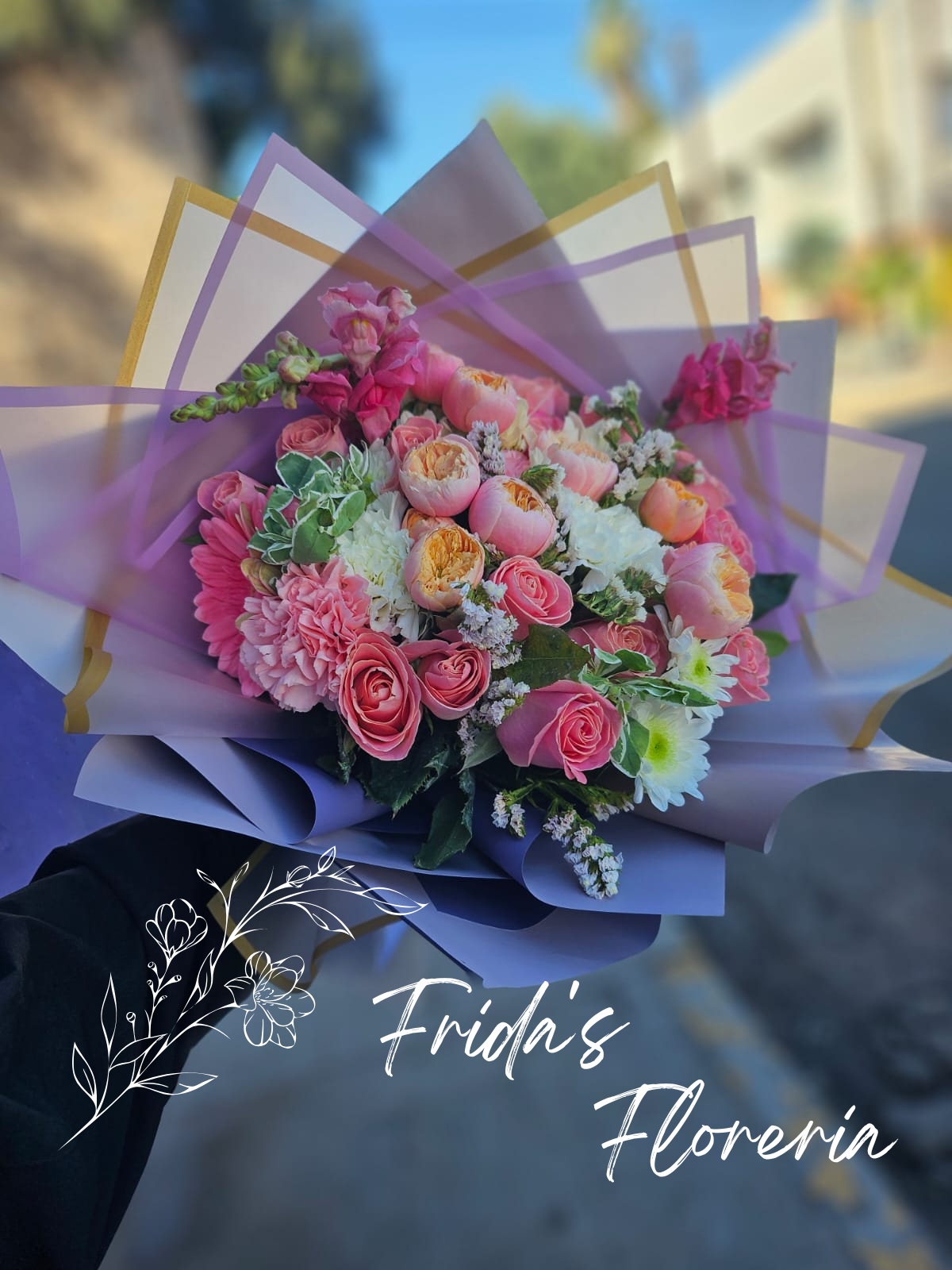 Ramo con elegantes rosas inglesas y rosa rosada, claveles, gerberas y flor variada fresca del dia.