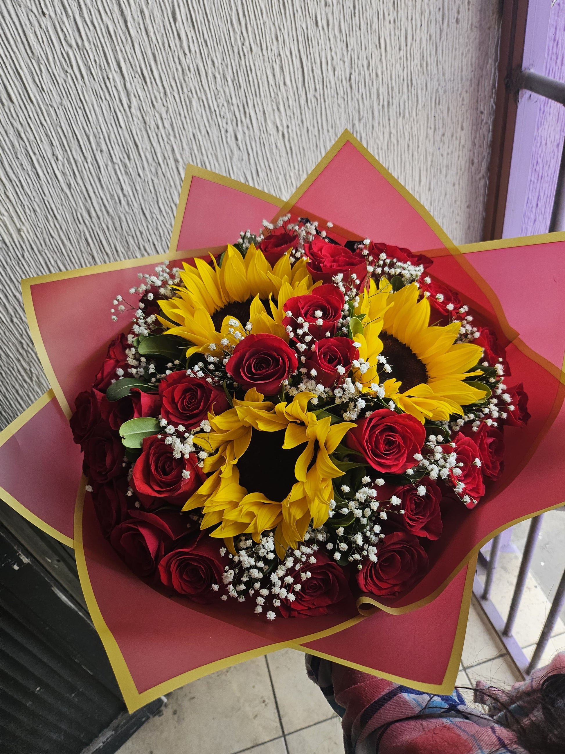 Ramo de rosas rojas con el color llamativo de los girasoles intercalados, sorprende a esa persona especial con este bello ramo que está detalladamente envuelto en papel coreano
