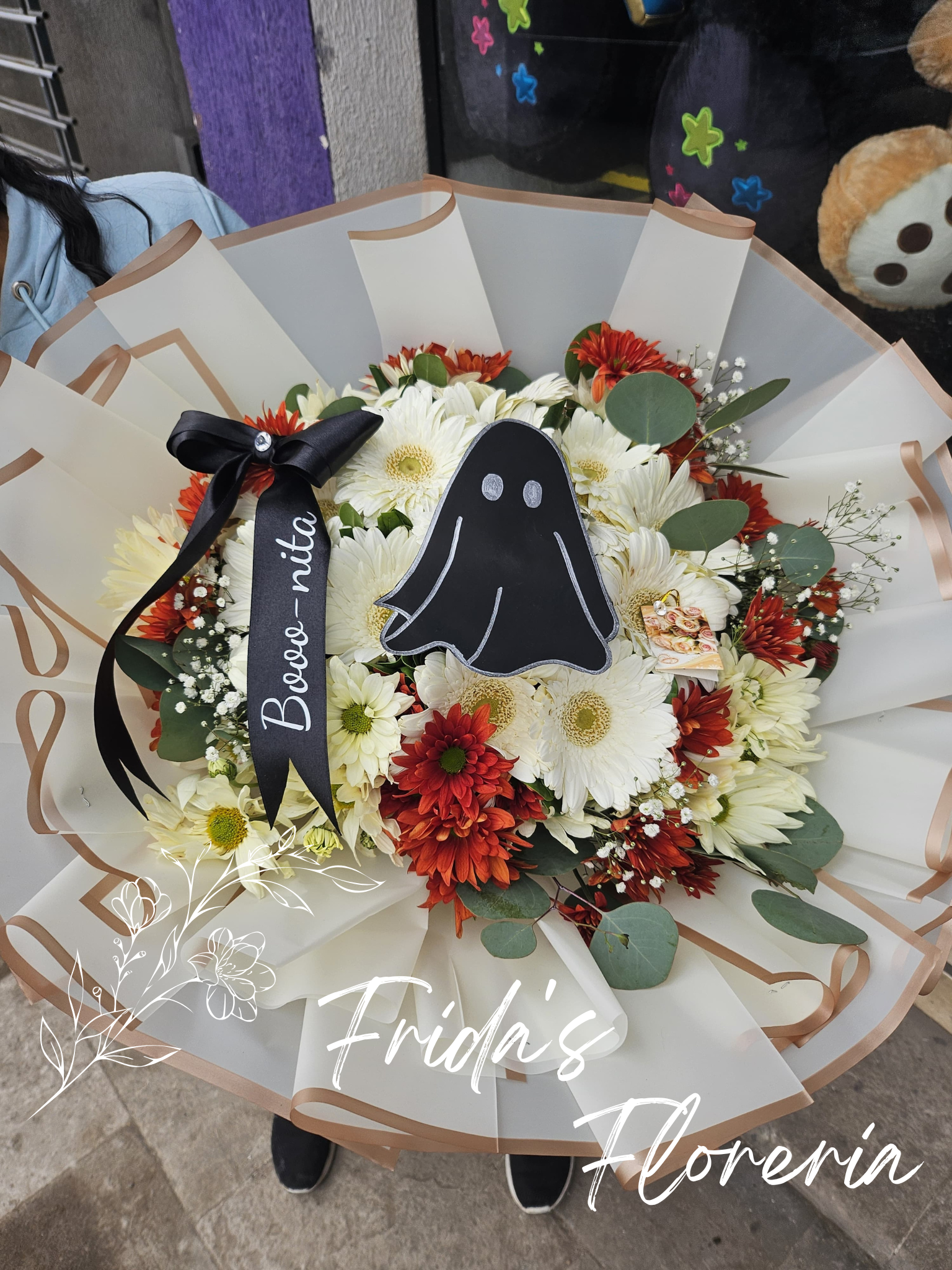 Ramo hallowinesco para regalar a tu novia este 31 de Octubre, compuesto de gerberas blancas, follajes y una imagen de un fantasma, con un liston personalizado que dice "Para mi boo nita".