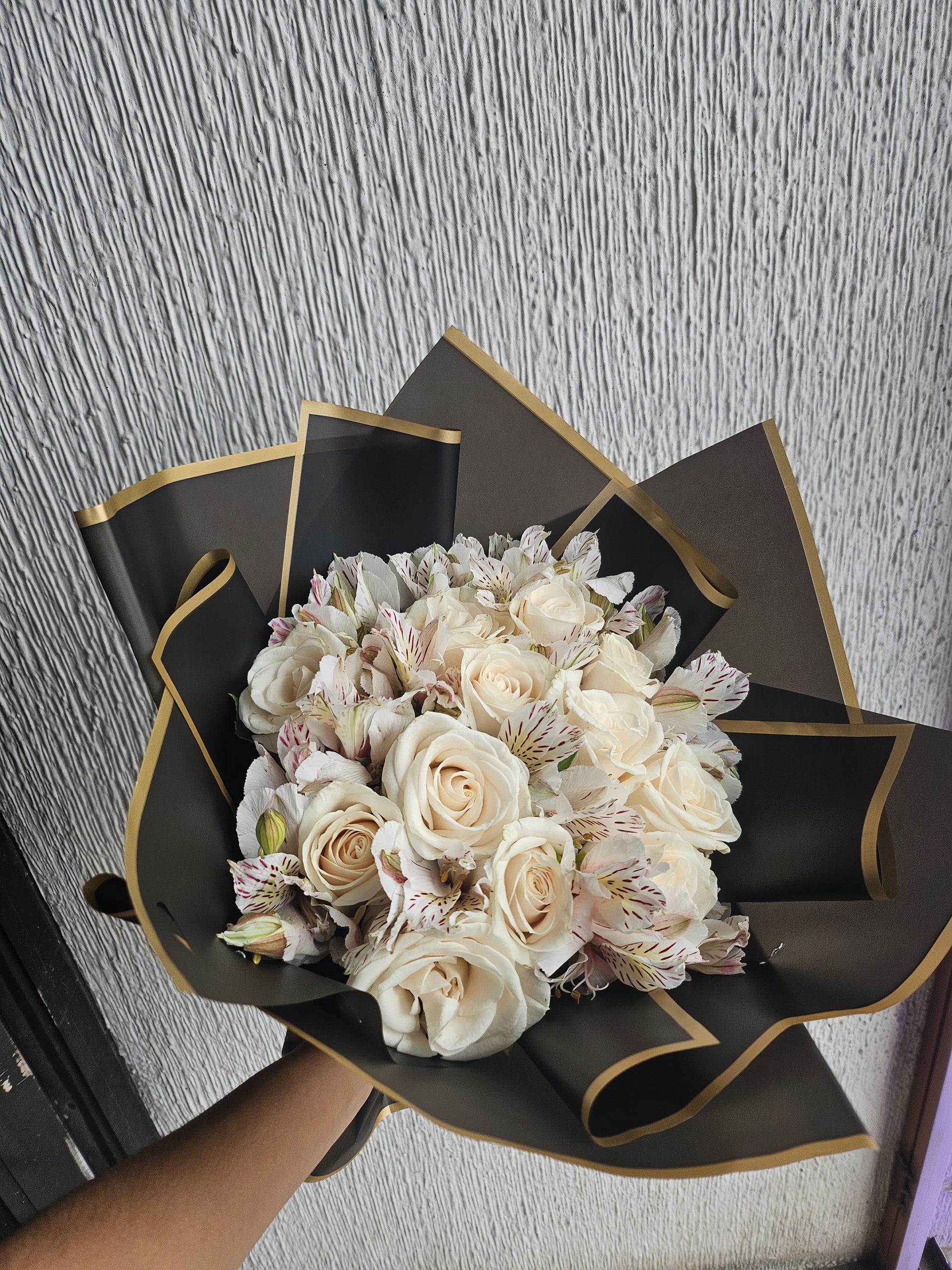 Hermoso y elegante ramo de 12 rosas blancas acompañadas de follaje y astromelias, muy especial para eventos tales como cumpleaños, bodas, bautismos, etc... Especial de nuestra floreria creada por nuestra florista.