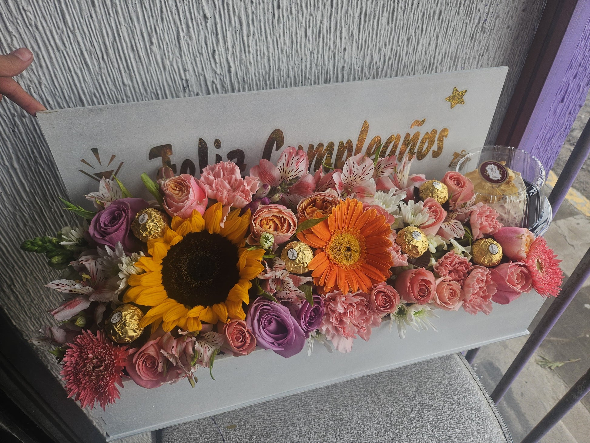 Caja floral surtida con rosas, girasoles, rosas y gerbera, acompañada con un pastel individual ideal para celebrar las ocasiones especiales en todo momento.
