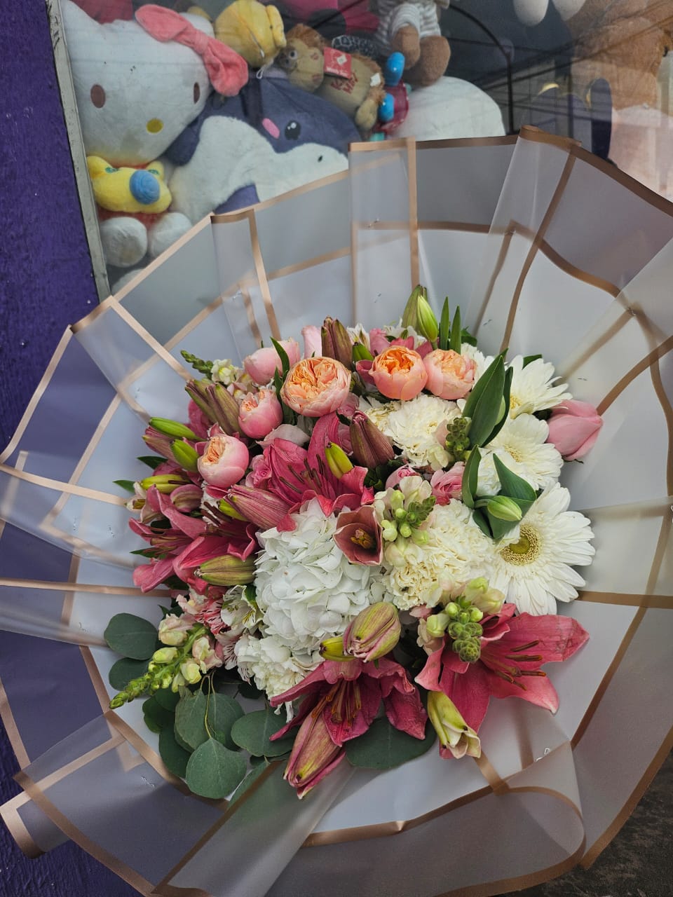 Hermoso ramo de flor fresca y variada entre rosas, gerberas, hortensia, rosa ingresa, follajes, entre otras flores, se pueden agregar tulipanes con costo extra de $100 c/u (La flor varia segun el dia que se pide porque se elabora con flor fresca).