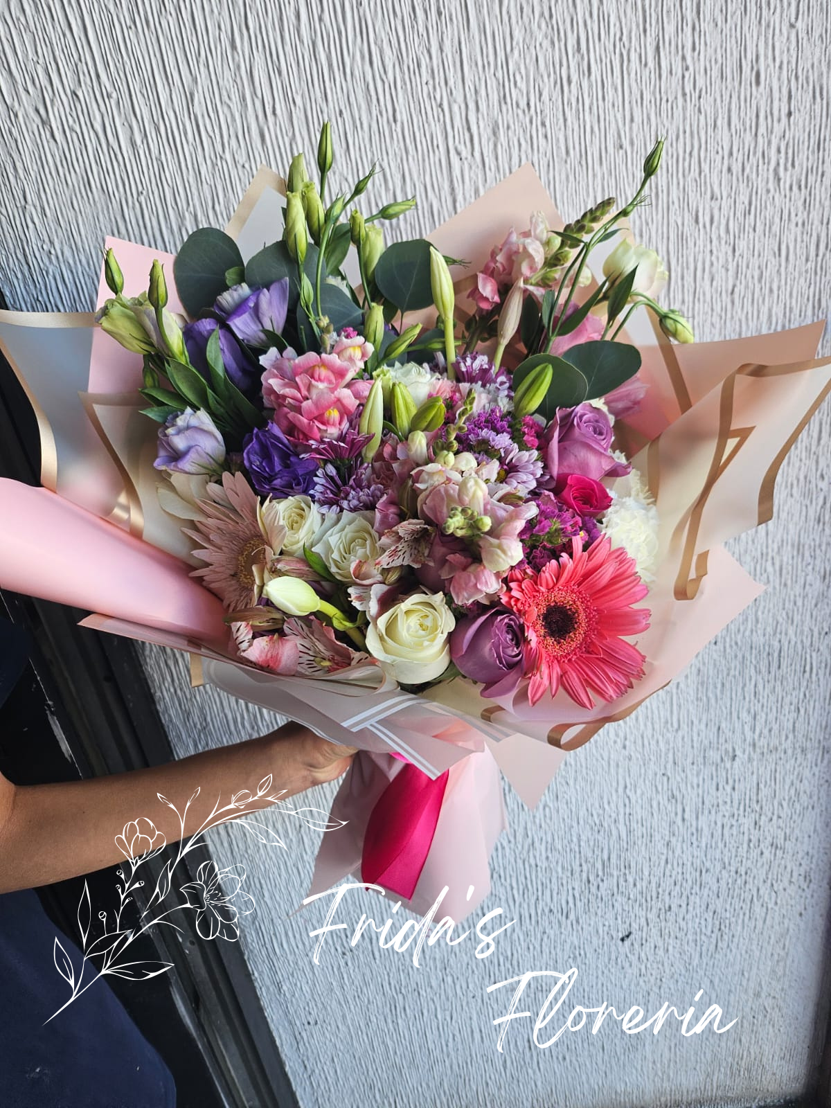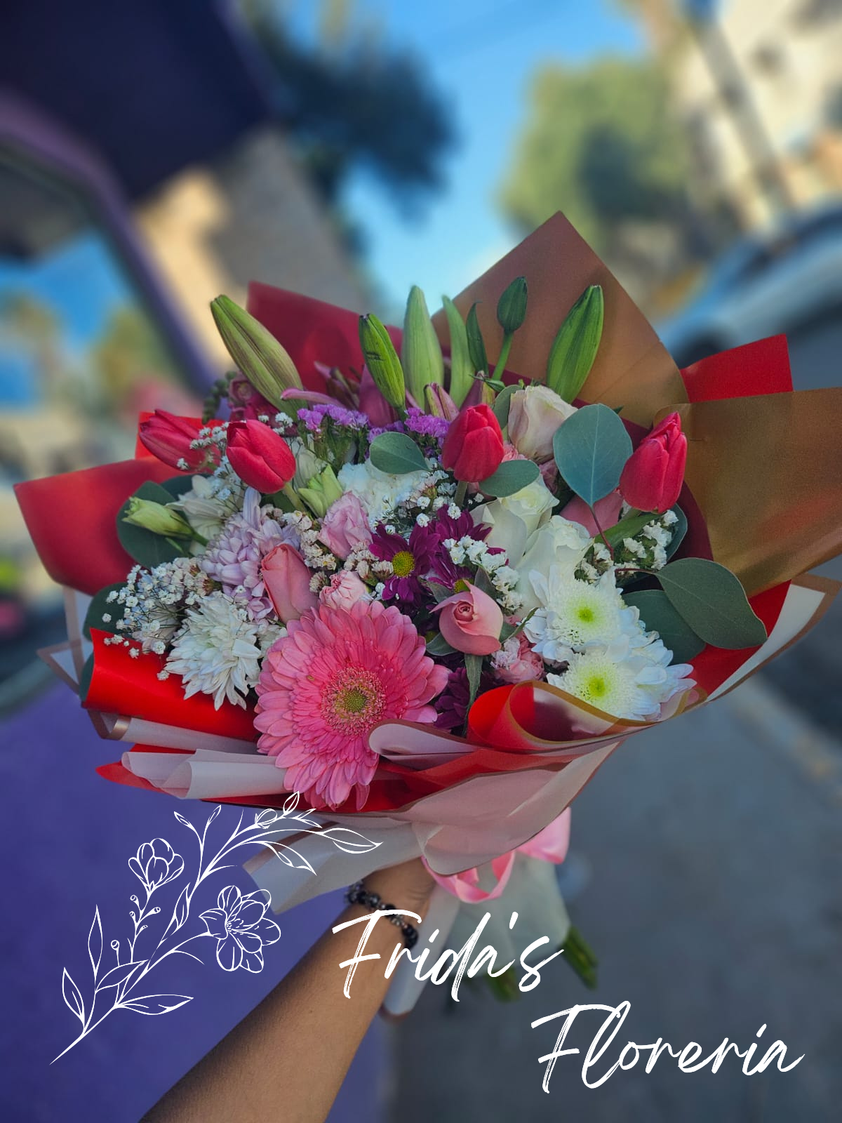 Precioso ramo de 4 tulipanes con lirios, rosas, claveles y follajes variados, este ramo se elabora con la flor disponible del dia en general incluyendo los tulipanes, para un color especifico favor de hacer el ramo con anticipacion.